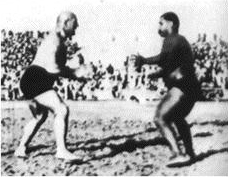 His real name was Ghulam Mohammed. A Muslim of Kashmiri wrestling stock. Gama defeated all comers in India with the exception of the extraordinary Ghulam Mohiuddin, with whom he had a two hour draw. His toughest opponent ever, was the 6'9" 270lb, Rahim Bux Sultaniwala. His victories over foreign wrestlers include Stanislaus Zbyszko (Poland), Dr. Benjamin Roller (U.S.), Johann Lemm (Switzerland), Maurice Deriaz (France), Jesse Peterson (Sweden), etc.
